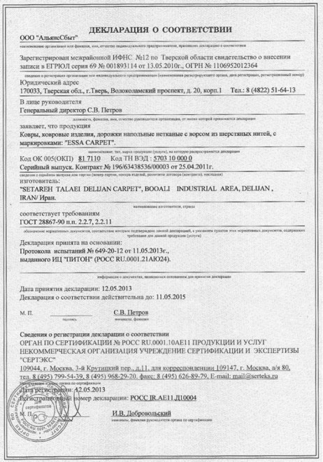 Каждый ковер имеет сертификат качества
